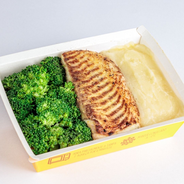 INGREDIENTES: TILÁPIA GRELHADA 100g: Saint Peter grelhado, limão alho, azeite e sal rosa do Himalaia. PURÊ DE BATATA100g: Batata inglesa, cebola, alho, salsa, água e sal rosa do Himalaia. BRÓCOLIS 100G: brócolis, água, azeite, alho e sal rosa do Himalaia.