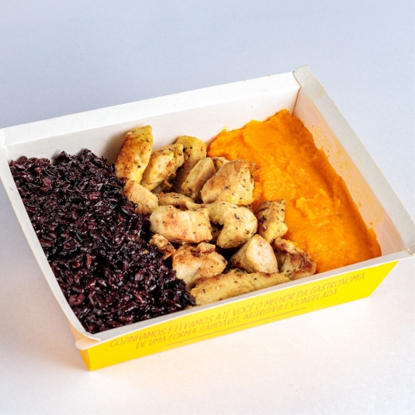 Delicie-se com nosso Frango Grelhado Com Lemon Pepper, uma porção generosa de 120g que promete seduzir o seu paladar. O prato é acentuado pelo Arroz Negro de 110g, cuja textura única e sabor intenso proporcionam uma experiência incomparável. Para completar a refeição, servimos uma Mousseline de Cenoura de 70g, preparada com maestria para encantar você com sua suavidade e sabor delicado. Juntos, esses ingredientes formam uma refeição de 300g, equilibrada e rica em sabor, que certamente irá satisfazer o seu apetite.