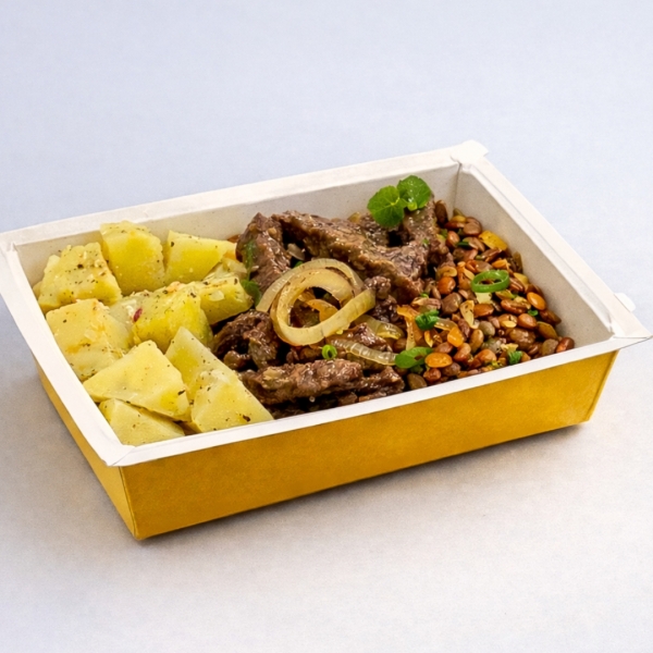 Energia e nutrição em um prato completo. As iscas de alcatra aceboladas são preparadas no ponto certo, macias e suculentas, trazendo proteína de alta qualidade. A batata-doce complementa com carboidrato de absorção gradual, ideal para fornecer energia ao longo do dia. Finalizamos com lentilha, rica em fibras, minerais e proteínas vegetais.